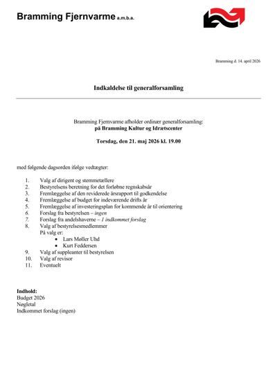 Herunder findes den fulde indkaldelse til generalforsamlingen d. 21. maj 2026