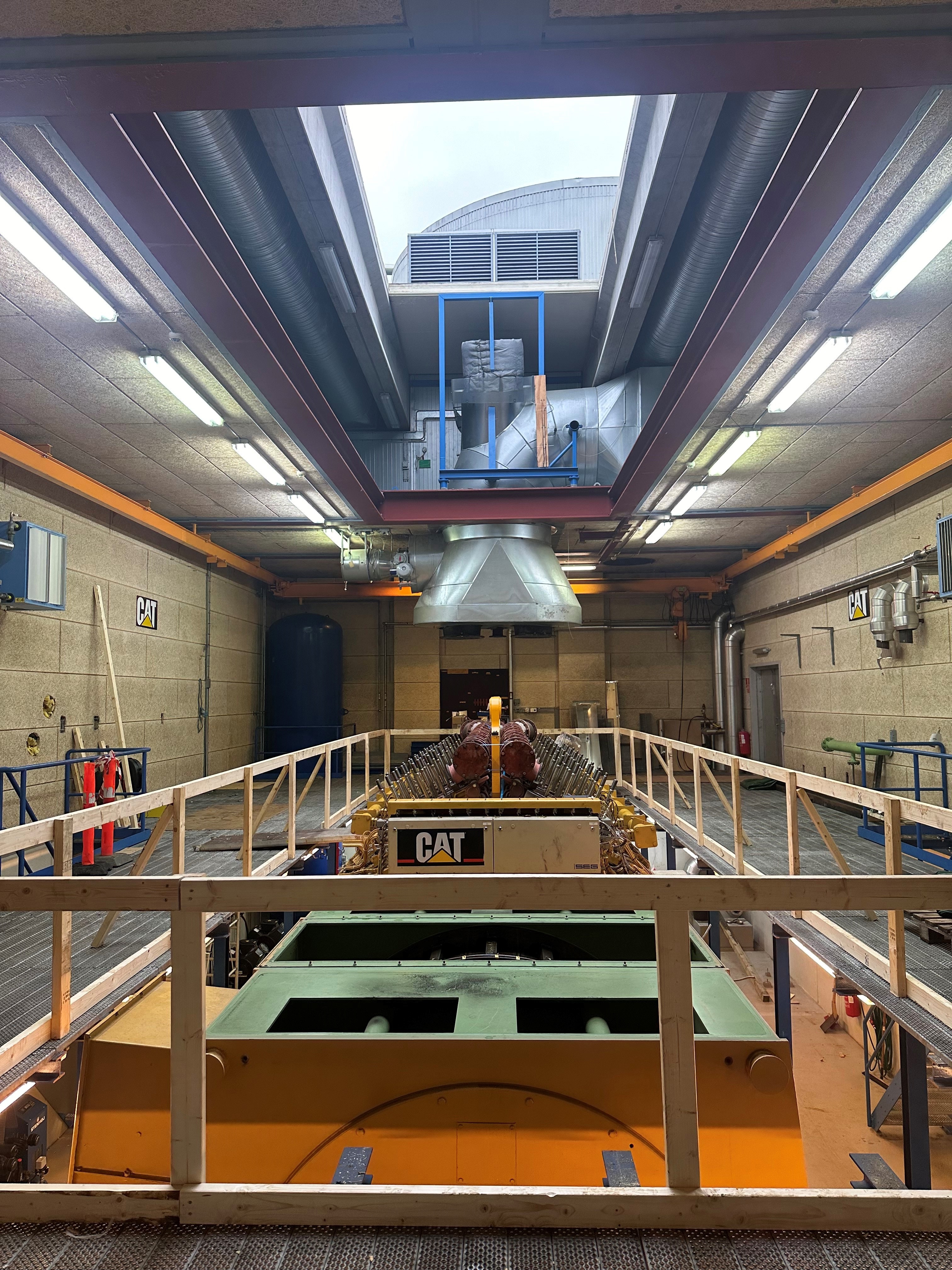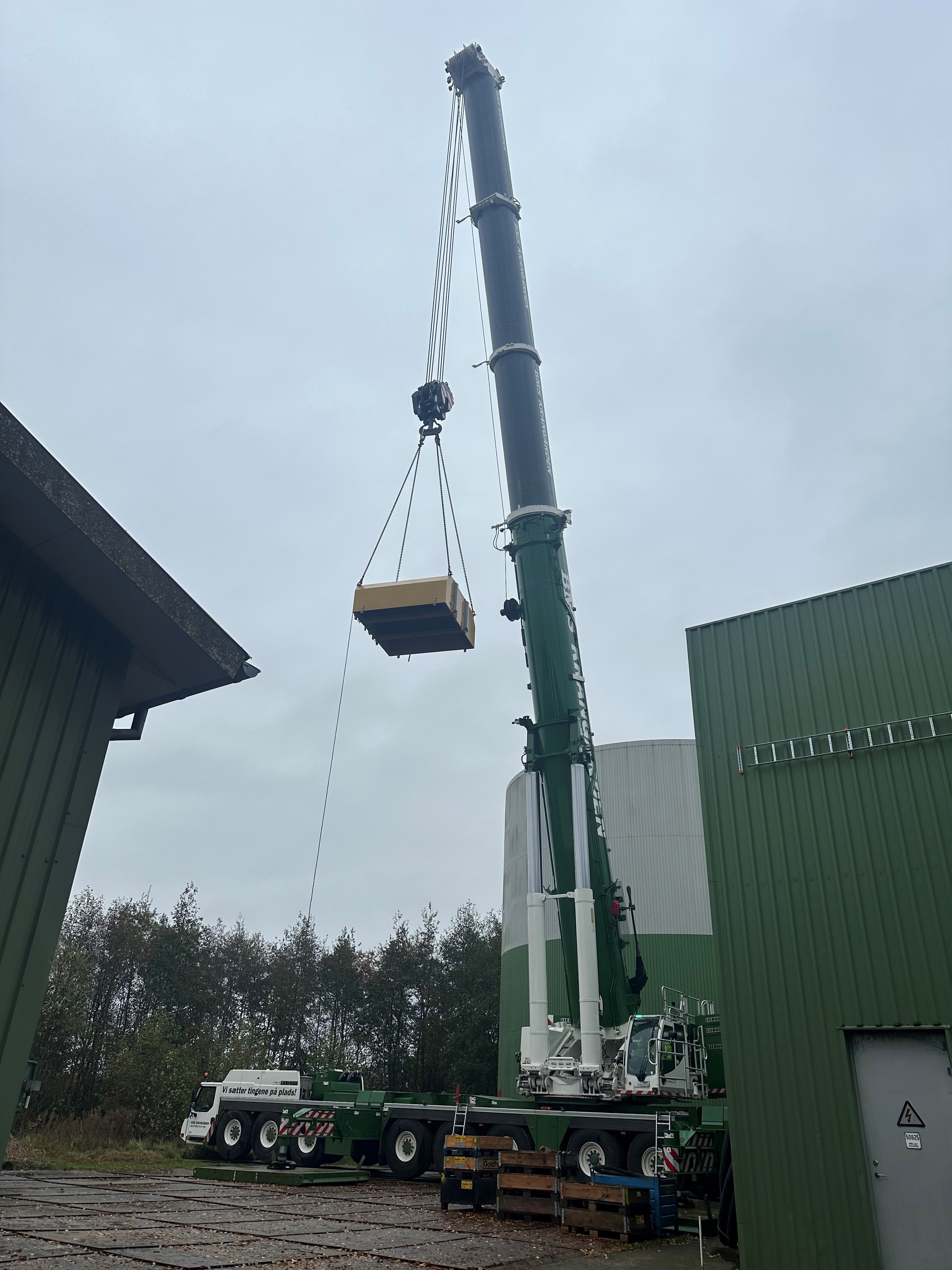 Kranen er på plads og arbejdet er i fuld gang. Motoren som vejer ca 140 tons, bliver løftet ud i tre dele – en stor og synlig milepæl i projektet.